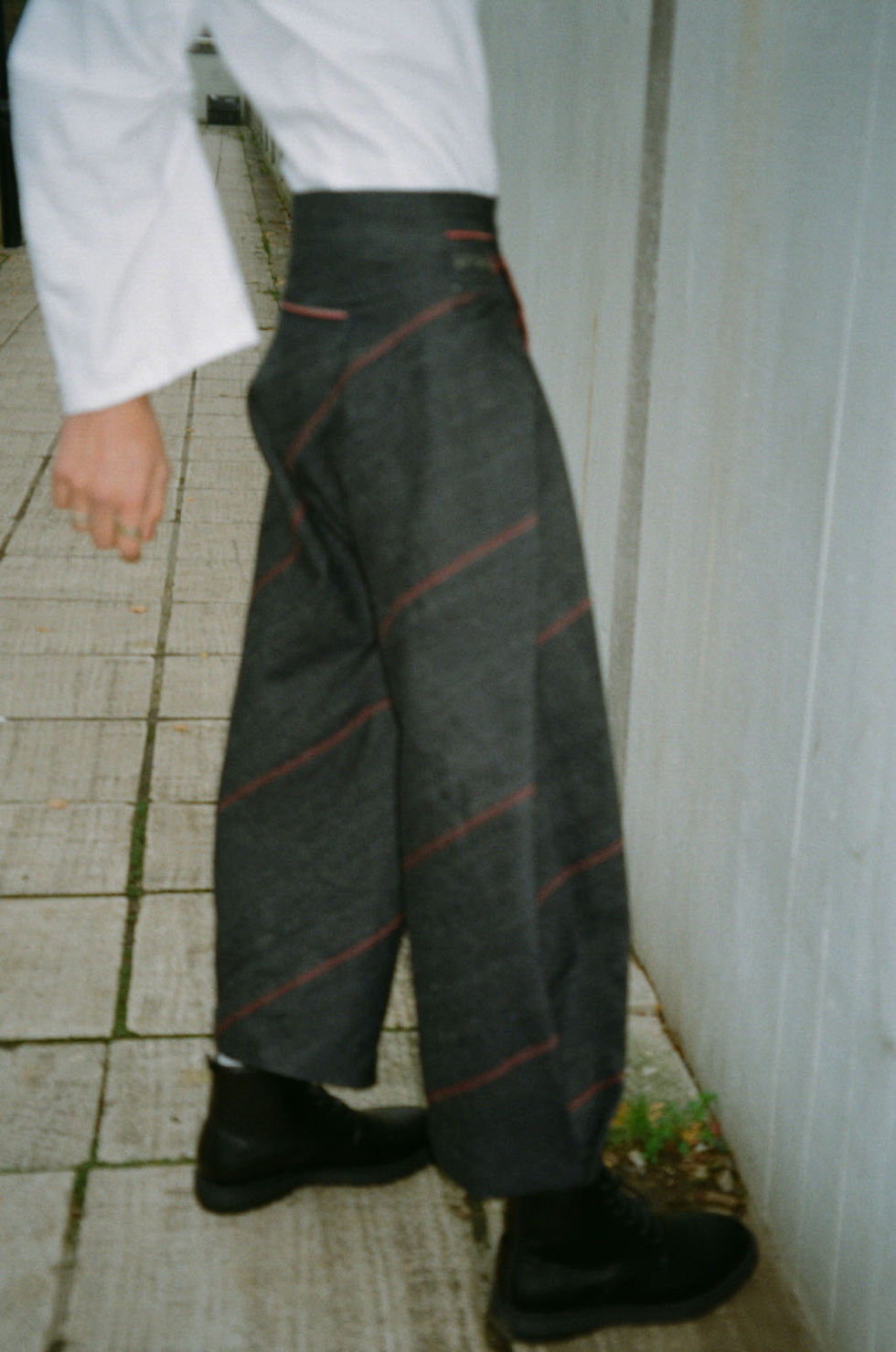 This is our collection 77; for this collection we were sponsored by Bossa denim and were given the chance to work with their 77cm wide Kayden red selvedge denim, whilst creating the garments we were focusing on minimal waste, use of electricity, and minimal stitching.